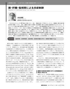 「腸管→肝臓→脳」で構成される自律神経反射は,「腸内細菌の乱れ」によって生じる現代病と深く関わっているとされる。当教室の研究を中心に、「腸-肝臓-脳相関による炎症制御」について概説されている。